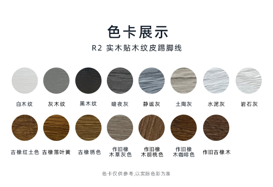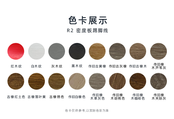 带弧型的斜边实木脚线,表面高保真木纹色皮面易于打理和清洁,圆滑外形设计不易积灰。材质跃升,用橡胶木A级指接做基层,配套老虎钉预装件同步安装,可使表面无钉孔。 不同高度和款型实木贴皮油漆面,背面预装老虎钉,脚线北面固定,正面无钉孔,确保装饰面美观,简约风格多种花色选择。
