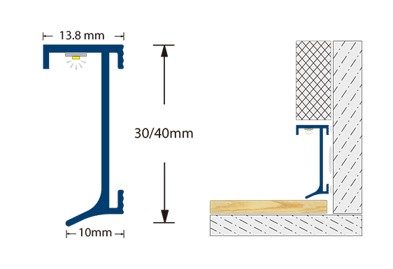 没有钩边的LED斜角内嵌脚线,应用在木墙板、瓷砖、石材等边缘坚固的主材脚线装饰,打胶直接粘贴即可。可连接智能,可调整光照明暗。